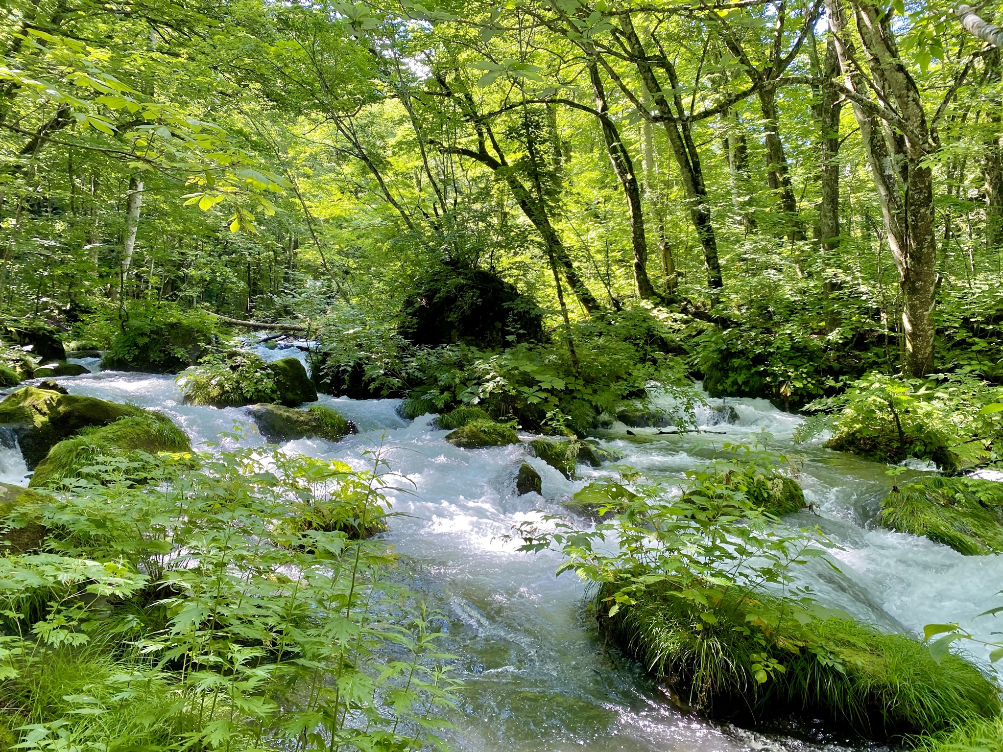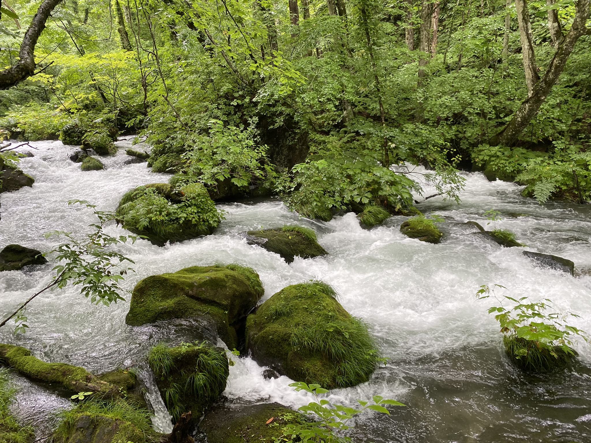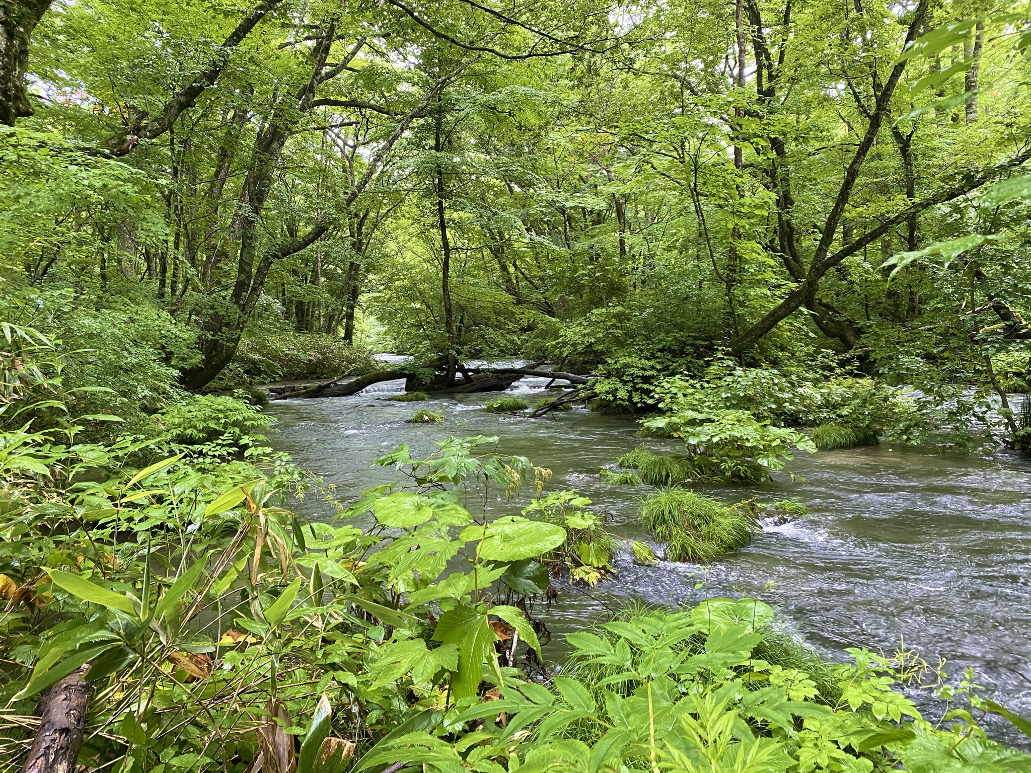 【旅:奥入瀬渓流@】![]() 7月下旬。長かった梅雨がようやく開けようとする中、以前から一度訪てみたいと思っていた「奥入瀬渓流」を訪ねた。 2泊3日の旅。 【初日】 朝9時過ぎに青森空港に降り立ち、タクシーで八甲田山を越え、予約していたホテルへと向かう。 昼食を済ませ、まずは近場の散策へ。 初めて知ったのだが、この渓流の源は十和田湖なのだそうだ。 ホテルは渓流の下流にあり、「石ヶ戸(いしげど)」というところまでゆっくりと遡った。 霧か雨かの区別がつかないミストを感じつつ、車道脇から、遊歩道へと入る。 割とゆったりとした木立の中の道は、長年の枯れ葉が堆積したのだろう、足を運ぶたびふわふわと押し返してきて、心地よい。 道の両脇のところどころには、苔むした倒木や岩が木々の緑に溶け込んで、静かに息をしながら佇んでいる。 しばらくすると「さらさら」という水音が近くなり、幅15m〜20mほどの流れが現れた。 この辺りは「とろ場」なのか、流れはいたって穏やかだ。 事前に見た写真とはすこし趣が異なる。 ![]() 緩やかなカーブをいくつか経ると、水音が変わり、小さな瀬が目に入ってくる。 川中には、こんもりとした小島があり、木賊の姿も見てとれる。 生花の素材や京都の町屋の軒先で見たことはあるが、自生するそれを目にするのは初めてだ。 遡るにつれ、瀬も次第に大きくなり、白い水しぶきが苔むす岩や木々の緑に映え、いっそうの清々しさを感じさせる。 やはり渓流の魅力は、この瀬の美しさと水音に尽きる。 ![]() 持参した折りたたみの三脚椅子に腰掛け、しばし流れに耳を傾ける。 右の瀬・中の瀬・左の瀬。 それぞれに流れ越える姿やスピードが異なり、一見単調に思える水音も、複雑に絡まりあって、深みを感じさせる。 さまざまに姿を変える流れを右手に見ながら進んでゆくと、 一枚岩の巨石が桂の木に倒れ込み、その下に人ひとりが入れるほどの空間ができている。 これが「石ケ戸」だ。 この地方では、小屋のことを“ゲド“というらしく、石の小屋ということで、 「石ケ戸」と名づけられたらしい。 ![]() ここまで距離にして、5Km。ゆっくり歩いて約1時間半の行程。 近くまでホテルのバスが迎えに来てくれており、それに乗せてもらって、ホテルへと帰還した。 |
