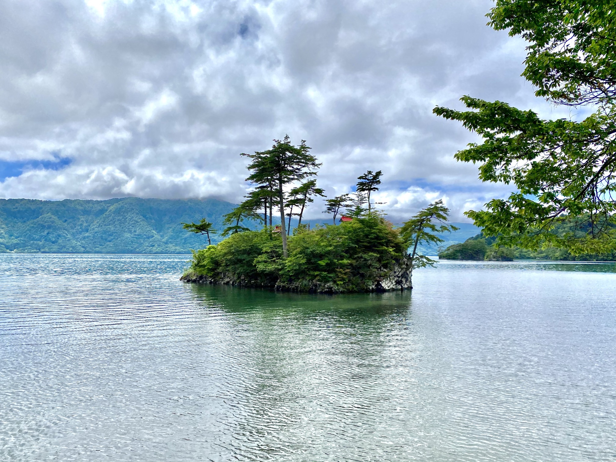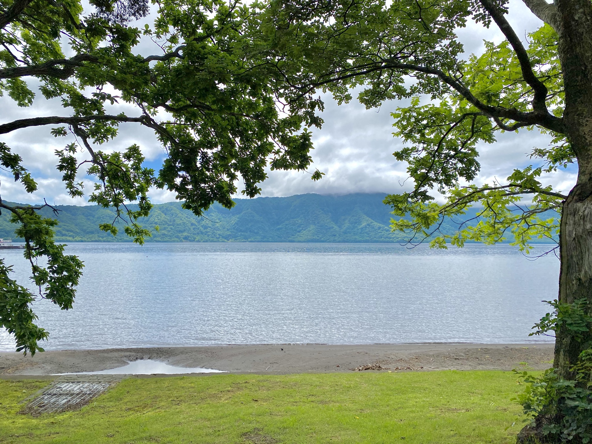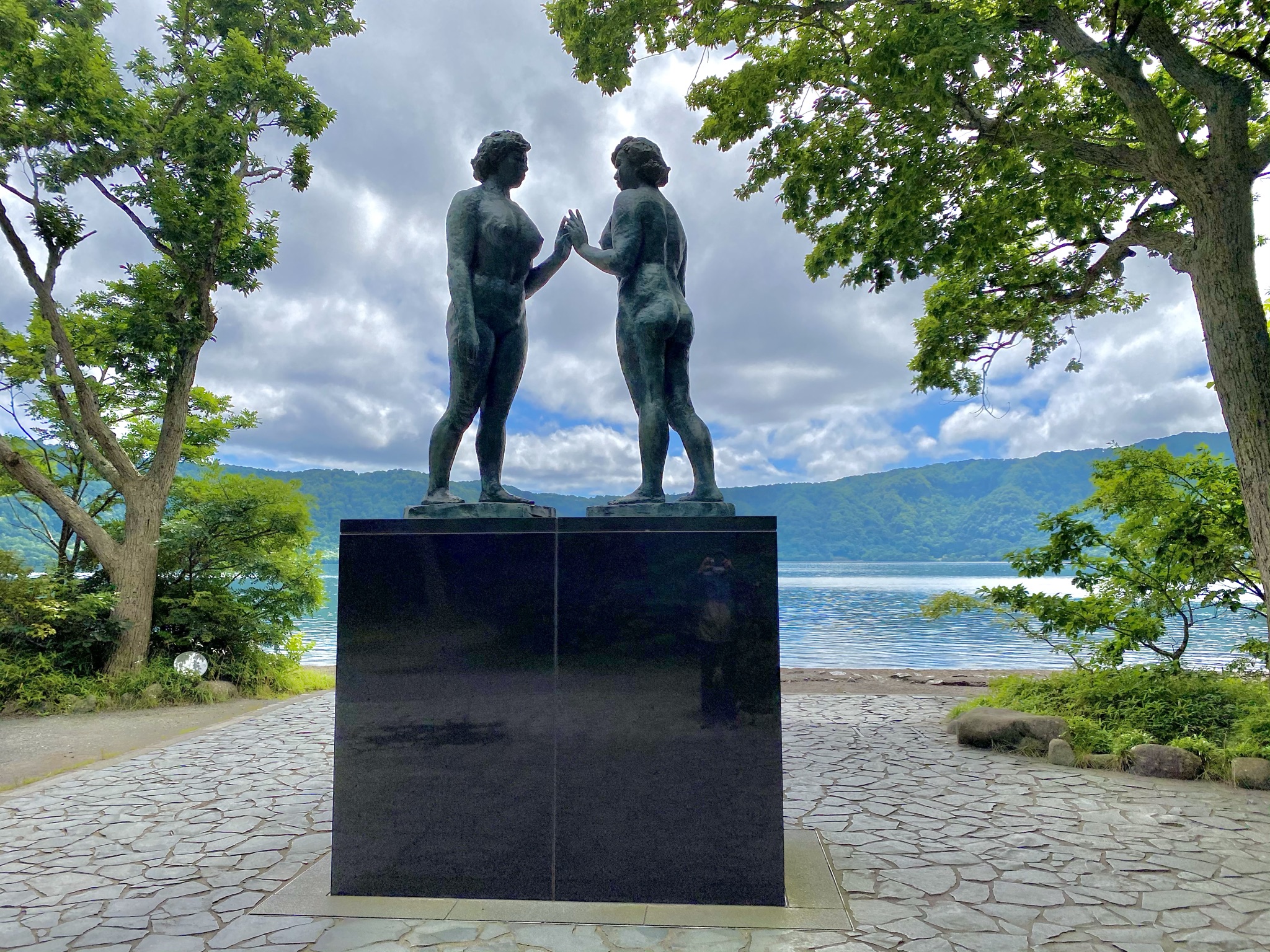 【旅:奥入瀬渓流C】【2日目 その3】 奥入瀬渓流をその源まで遡り、十和田湖の東端「子ノ口」に出る。 時が止まったように穏やかな湖面が、音もなく悠然と佇んでいる。 人が少ないせいもあってか、ほんとうに静かで、時折り吹き抜ける滑らかな風だけが唯一、動きを感じさせるくらいだ。 ![]() 十和田湖は地図で見るその形からもわかるように、火山の火口に雨水などが溜まってできたカルデラ湖だ。 陥没したところだけでもこの大きさなのだから、元の火山のスケールが思い知られる。 「子ノ口」からは周遊船が出ている。 乗り場の受付のおばさんが、湖畔の見所などを詳しく教えてくれる。 南にいった「休屋」というところが拓けていて、お勧めとのことだ。 ここから周遊船かバスで行けるらしい。 帰りを船にし、バスで向かうことにする。 湖畔の並木を抜けながら、20分くらいで「休屋」に着いた。 ここの港は、先ほどの「子ノ口」との間に突き出した御倉半島の西側、中山半島の入江に位置しており、周辺に旅館やホテル、食事処などが点在している。 ![]() 遅まきの昼食をとるため、近くの食堂に入る。 何か名物あるかとメニューを見ると、「ひめマス」のお造りと塩焼きというのが載っている。 以前、琵琶湖畔の醒井で「びわマス」を食べたことがあるが、湖のあるところでは、「マス」が育ちやすいのだろうか。 お造りの見た目は、言われなければ「サーモン」かと思うくらいよく似ている。 味のほうは、「サーモン」に比べさっぱりとはしているものの、ほどよく脂がのっており、なかなかの美味だ。 食事を終え、湖畔を散策すべく外に出ると、これまでずっと曇っていた空から陽射しが照りはじめ、急に明るさと暑さをもたらしてくる。 有名な「乙女の像」がこの先にあるとのことで、そこまでのんびりと歩いてみることにする。 途中、汀近くに小島が見えてくる。「恵比寿大黒島」というそうだ。 溶岩でできた島らしく、よく見るとふたつの島が寄り添っており、それぞれに赤い屋根の小さな祠が建てられている。 どちらが恵比寿さんでどちらが大黒さんなのかはわからないが、島も祠も愛らしい。 ![]() 「恵比寿大黒島」を左手に見ながらすこし行くと、浜辺からすこし引っ込んだところに、「乙女の像」が見えてきた。 思っていた像と姿も位置も違っている。 「確か湖の中にひとりの少女の像が立っているはずだが…」 どうやら田沢湖の「たつこ姫の像」と勘違いをしていたようだ。 あとで調べてみると、意外にもこの十和田湖と田沢湖とはある伝説でつながっていることがわかった。 さて、実際の「乙女の像」は、ふくよかな体つきをしたふたりの少女が向かいあい、 おたがいの左手どうしをふれあわせ、何かを伝えあっているような、重みのあるブロンズ像だ。 ![]() 作者は高村光太郎。最期の作品だそうだ。 どっしりと地に足をつけ、強い意志をもって立つ姿は、“乙女”というよりも、さまざまな苦楽を経験した逞しい女性の姿に見えるのだが、どうなのだろう。 創作されたのは、戦後数年ほど経った頃らしいから、戦中を生き抜いてきた女性の強さと、再建を図ろうとする誓いを表現しているのかもしれない。 |